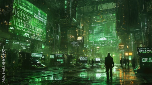 Futuristic cityscape with neon green lights and digital screens, showcasing a bustling urban environment
