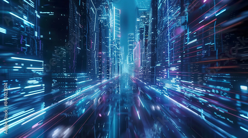 futuristic cityscape with neon lights, abstract architecture, and vibrant colors
