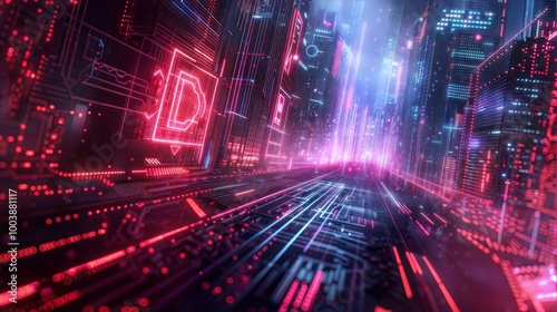 Futuristic Cityscape with Neon Lights and Digital Data Streams at Night