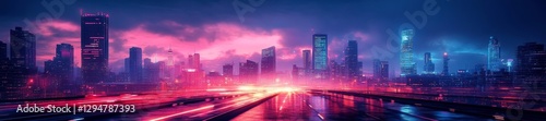 Futuristic cityscape with neon-lit highways and tall buildings glowing in the dark. Generative AI