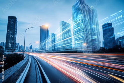 Futuristic Cityscape with Skyscrapers, Motion Blur from Cars, Digital Screens, and Soft Lighting Highlighting Architectural Innovation and Technological Advancement