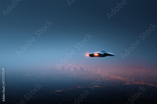 Futuristic cityscape with sleek spacecraft hovering above the illuminated skyline against a moody, atmospheric sky. Perfect for scifi, technology, or urban planning themes.