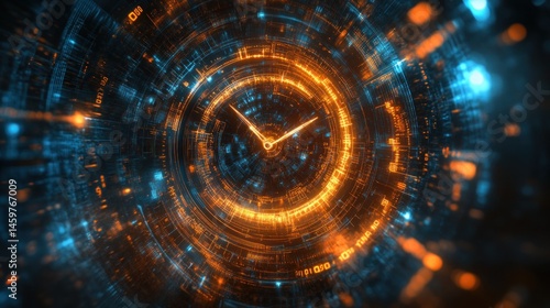 Futuristic clock face with glowing digital elements.