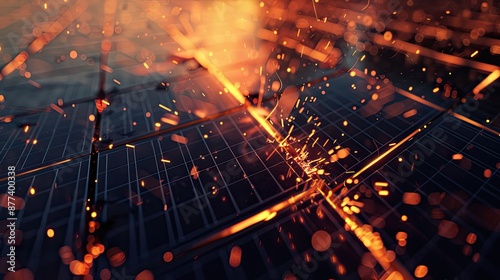 Futuristic Closeup of Damaged Solar Panel Emitting Sparks in Dark Tones with High Detail