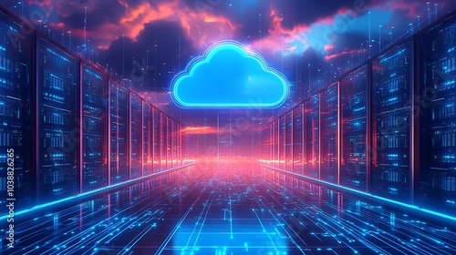Futuristic Cloud Computing Network Servers. Digital illustration of cloud computing infrastructure with vibrant blue neon lights and futuristic data servers.