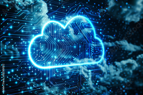Futuristic cloud computing technology concept with virtual cloud symbol and digital data connections on abstract blue background