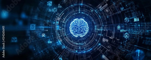 Futuristic Concept of Artificial Intelligence Represented by Digital Brain Surrounded by Network Connections and Data Elements in Dark Background
