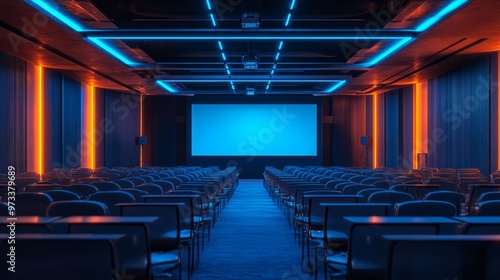 Futuristic conference hall with blue lighting and large screen. Modern design concept.