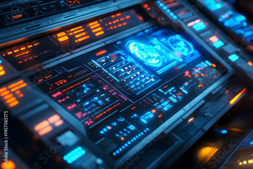 Futuristic control panel displays data and information in a dark interior.