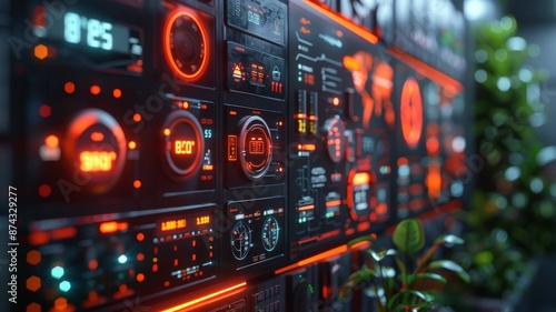 Futuristic Control Panel with Illuminated Digital Interface, High-Tech Dashboard Display with Various Gauges and Graphs in Modern Technology EnvironmentFuturistic