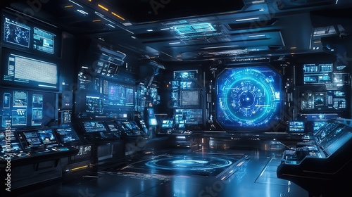 Futuristic control room with advanced technology and holographic displays in a sleek, modern design
