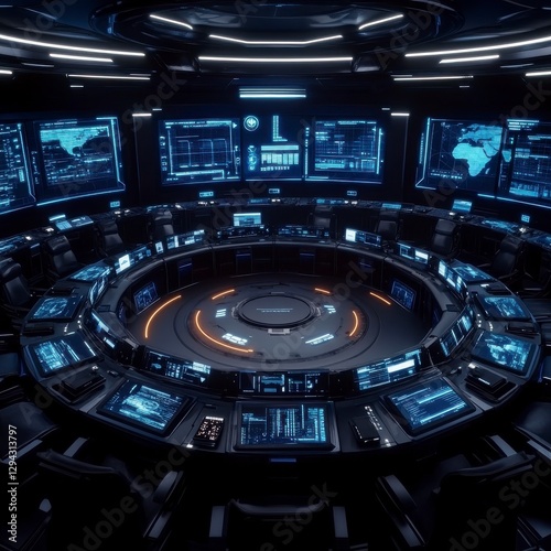 Futuristic Control Room with Glowing Blue Interfaces and Circular Table