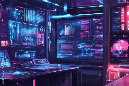 futuristic control room with glowing screens displaying data analytics in neon blue and pink tones. cyber security and technology concept. digital world, tech innovation, sci-fi