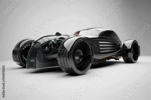 Futuristic custom hot rod posing in a studio with gray background, showing its unique design and shiny black paint