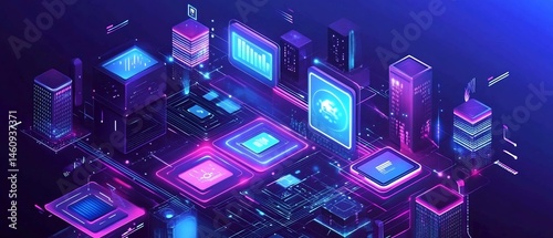 Futuristic cybernetic city landscape with glowing neon structures and screens
