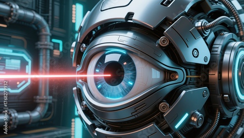 Futuristic Cybernetic Eye with Laser Emission in High-Tech Environment