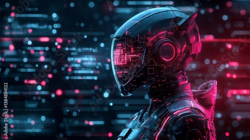 Futuristic Cybernetic Helmet with Neon Digital Effects in Dark Space