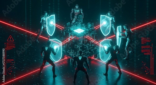 Futuristic Cybernetic Soldiers Guarding a Central Geometric Structure with Red Neon Accents