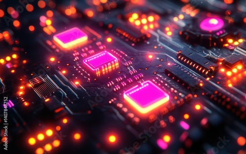 Futuristic Cyberpunk Circuit Board Design with Neon Colors and Glowing Gears for Industry 4.0 and Engineering Technology