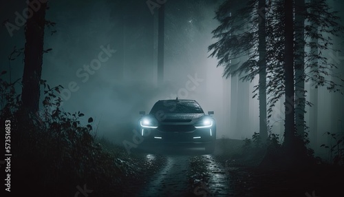 Futuristic cyberpunk sports car driving through mist forest conceptual photo generatie ai,