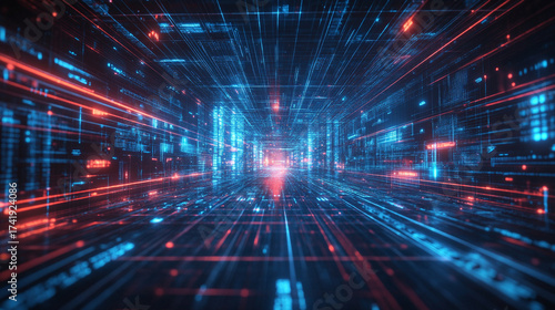 Futuristic cyberspace with a glowing digital grid network, depicting virtual space and advanced cyber technology, ideal for tech, digital, and sci-fi visuals.