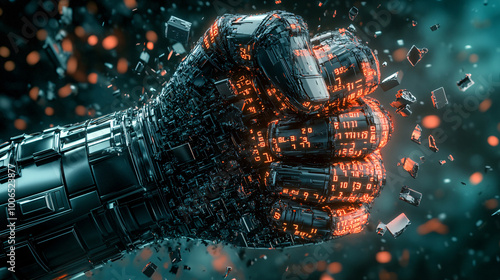Futuristic Cyborg Hand Crumbling and Breaking Apart With Red Glow 3D Rendering