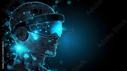 Futuristic Cyborg Head Wearing VR Headset in Digital Network