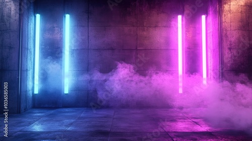 Futuristic dark grunge concrete room featuring glossy smoke and purple blue glowing neon tube lights creating an empty reflective stage background for 3D text rendering