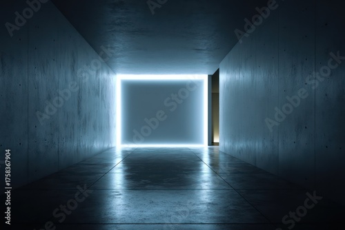 Futuristic dark room with illuminated blank screen on wall