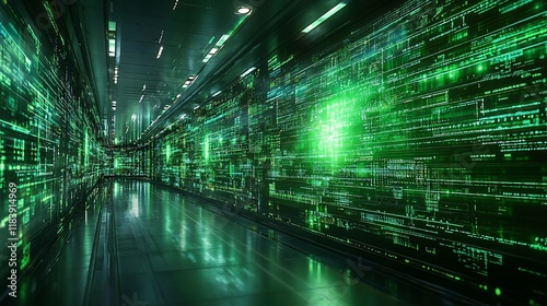 Futuristic data center corridor; green code streams; server room; digital technology; abstract background