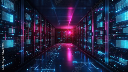 Futuristic Data Center Corridor with Neon Lights in Blue and Pink Hues
