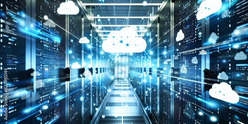 Futuristic Data Center with Cloud Computing Integration, showcasing advanced server technology and high-tech infrastructure, representing the digital transformation, Generative AI