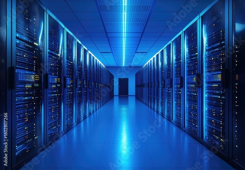 Futuristic data center with symmetrical rows of glowing blue server racks under bright LED lighting, showcasing advanced cloud computing, storage, and digital infrastructure