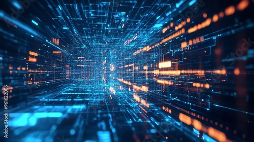 Futuristic data tunnel with vibrant blue and orange lights, representing digital networks and advanced technology in motion.
