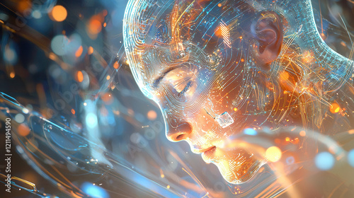 futuristic depiction of artificial intelligence with glowing human like face, intricate circuits, and vibrant light effects, evoking innovation