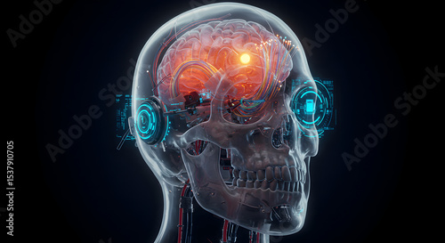 Futuristic depiction of the human brain inside a transparent skull with technology
