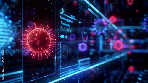 Futuristic digital art showcasing a virus simulation with glowing red and blue elements on a high-tech background.