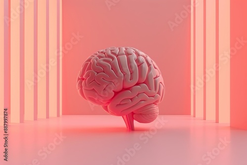 Futuristic digital art with a pink brain in a neon-lit environment, symbolizing technology and creativity, set against a light background.