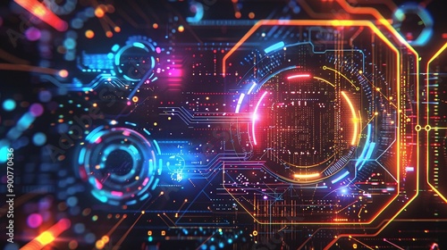 Futuristic Digital Art with Neon Lights and Geometric Shapes, High-Resolution Abstract Background for Technology, Sci-Fi, and Modern Themes, Featuring Bold Colors and Dynamic Composition