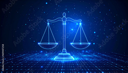 Futuristic Digital Balance Scale Floating in a Data Grid with Blue Light Particles in a Dark High-Tech Environment Representing Justice and Technology