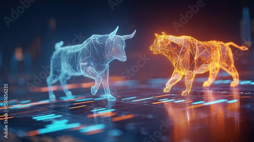 Futuristic digital bulls in glowing wireframe design facing each other in digital trading environment.