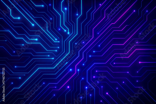 Futuristic digital circuit board with bright blue and pink neon lines and glowing nodes abstract technology
