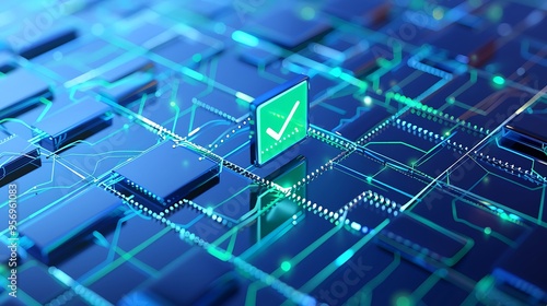 Futuristic digital circuit board with glowing lines and a checkmark icon, representing technology, security, and data processing.