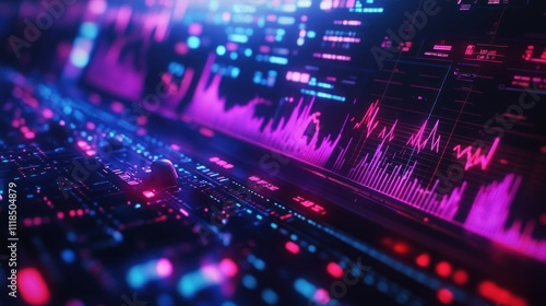 Futuristic digital dashboard displaying vibrant pink and blue graphs and data.
