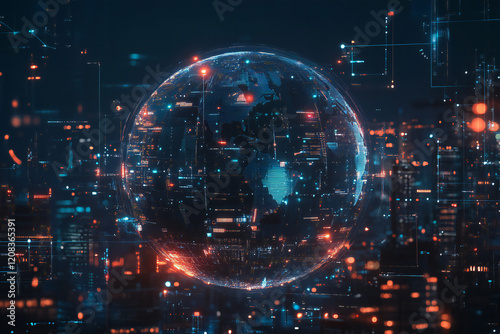 Futuristic Digital Dashboard Overlay on Smart City Skyline Showcasing Data Visualization, Urban Innovation, and Global Technology