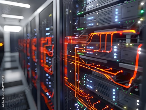 Futuristic Digital Data Center Network Diagram with Cables and Lights