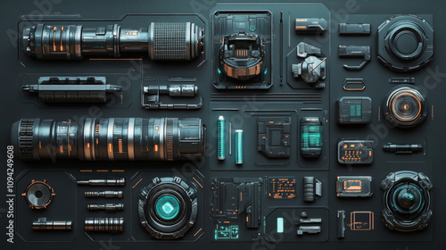 Futuristic digital designs and tech parts. Perfect for cyberpunk games, sci-fi movies, and tech visuals.