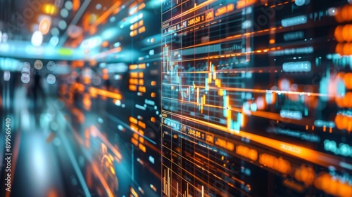 Futuristic Digital Financial Data Display with Graphs and Charts in a Modern High-Tech Environment