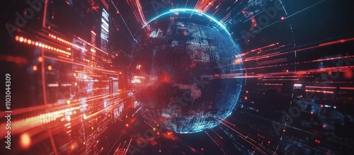 Futuristic digital globe surrounded by red and blue data streams.
