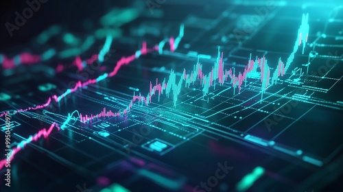 Futuristic digital graph showcasing market trends with vibrant colors and intricate data patterns.